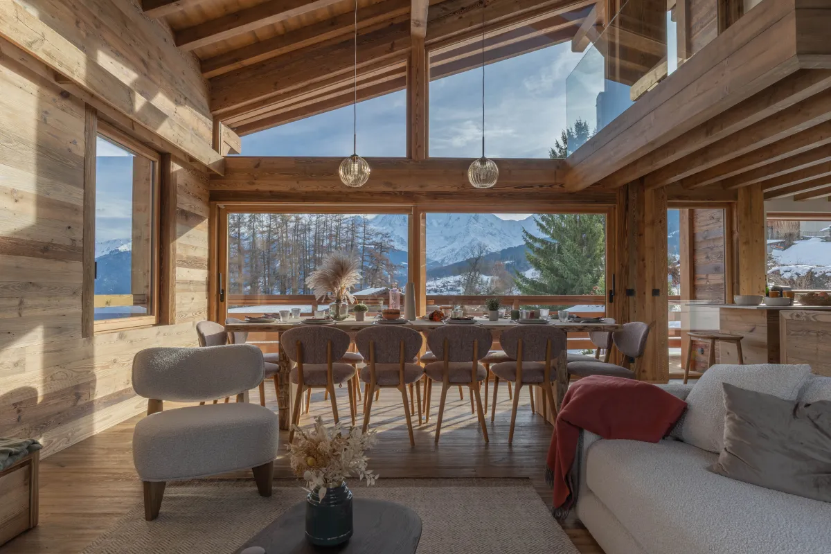 Ce chalet neuf, pensé pour accueillir au maximum 12 personnes, allie le charme chaleureux du vieux bois à un confort moderne. Chaque détail a été étudié pour offrir une ambiance authentique et conviviale, où tradition alpine et équipements contemporains se rencontrent. Entre espaces de vie lumineux, chambres confortables et vues spectaculaires sur le Mont-Blanc, le chalet est le point de départ idéal pour des séjours inoubliables en famille ou entre amis.