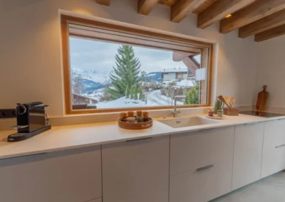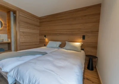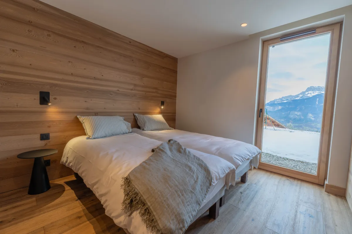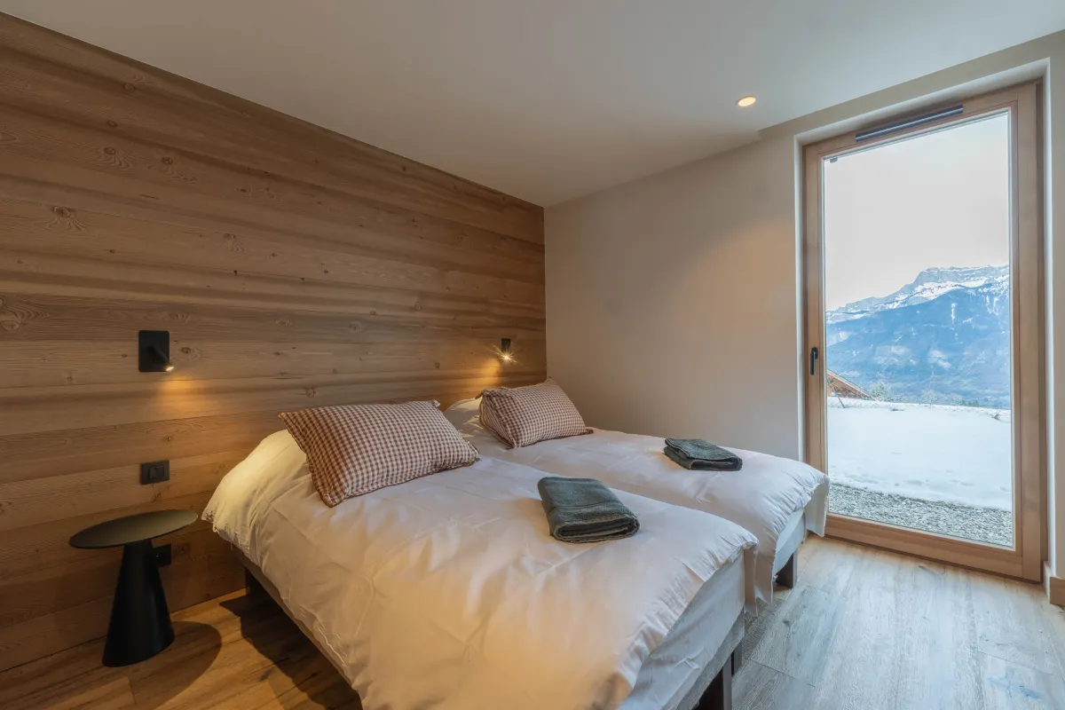 À l’étage supérieur, la suite parentale propose un lit 160 cm, une salle de bain avec baignoire et un balcon privatif offrant un panorama unique sur les montagnes. L’étage accueille également une chambre enfants avec quatre lits superposés et une salle d’eau, idéal pour les familles.