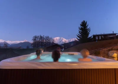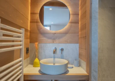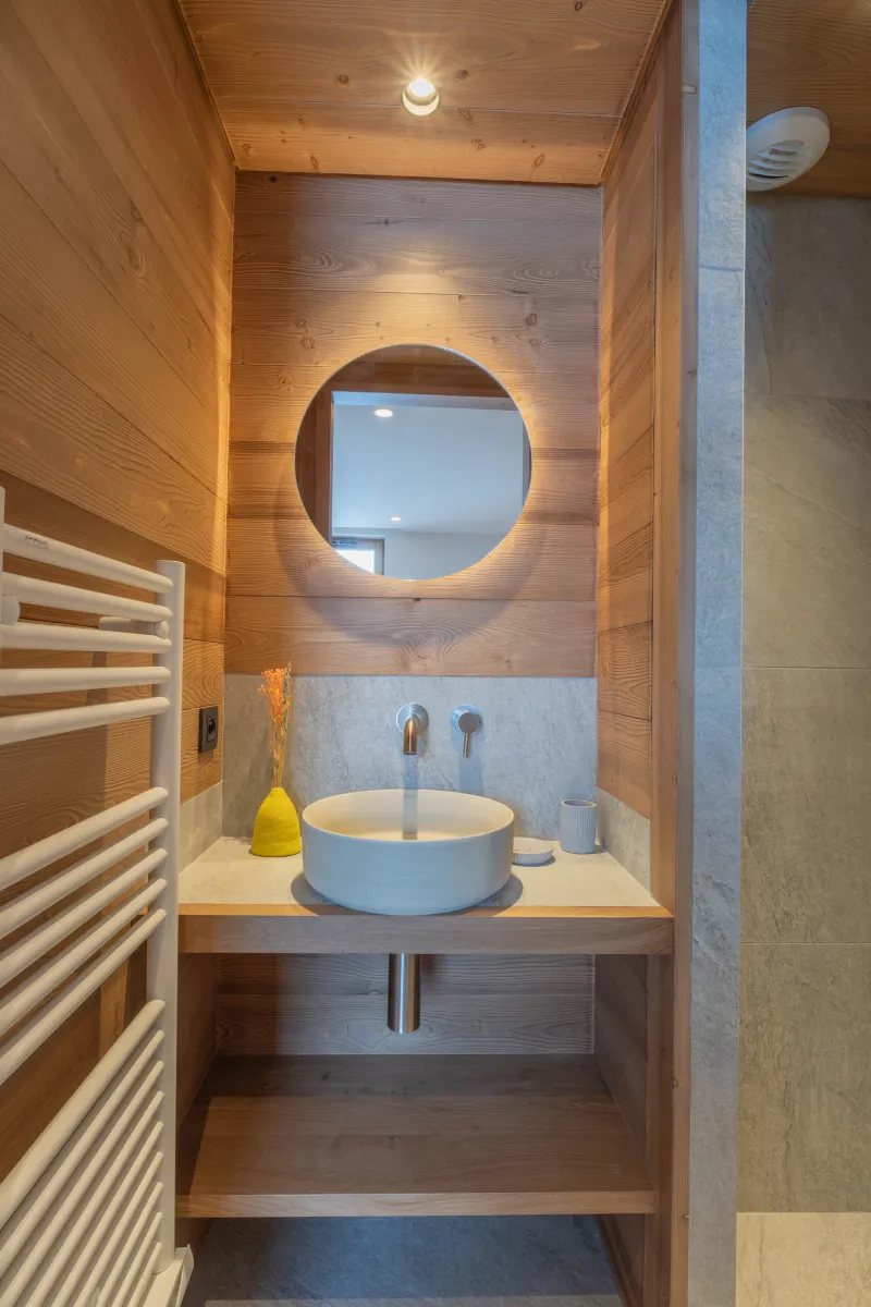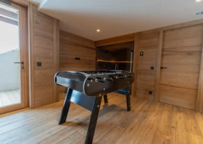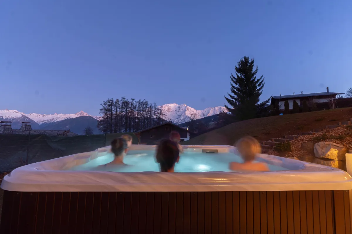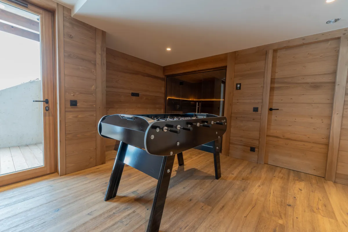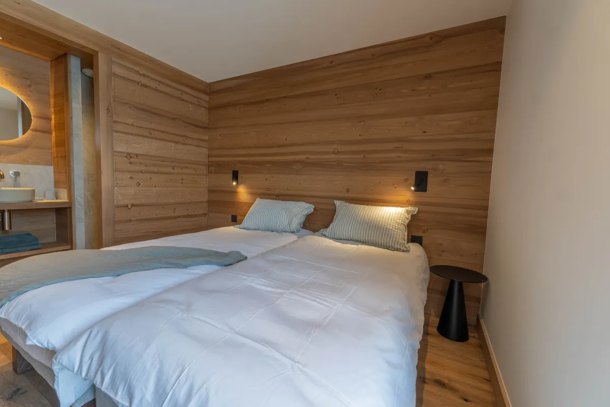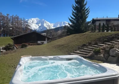 Le rez-de-jardin du chalet accueille trois chambres doubles avec lit 160 cm ou twin (2 lits de 90), chacune équipée d’une salle de bain avec douche privative. Conçu pour le confort et la convivialité, cet étage dispose également d’un espace sauna pour se relaxer après une journée sur les pistes ou en randonnée, ainsi que d’un jacuzzi extérieur offrant une vue exceptionnelle sur le Mont-Blanc, pour des moments de détente inoubliables en famille ou entre amis.